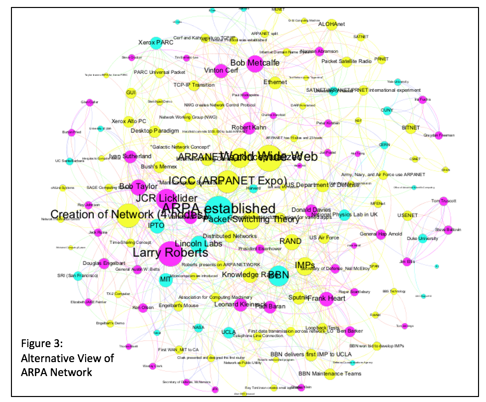 This project examines the history of the early Internet with the development of the ARPA Network as it’s been told through chronological narratives. Within these chronological narratives, the history unfolds as if ARPANET’s development was inevitable causation rather than purposeful correlation. However, the development of the Internet did not happen in a linear or even in an orderly process; the development of the Internet came about because the right people, places, and ideas came together at the right or “particularly appropriate” moment.