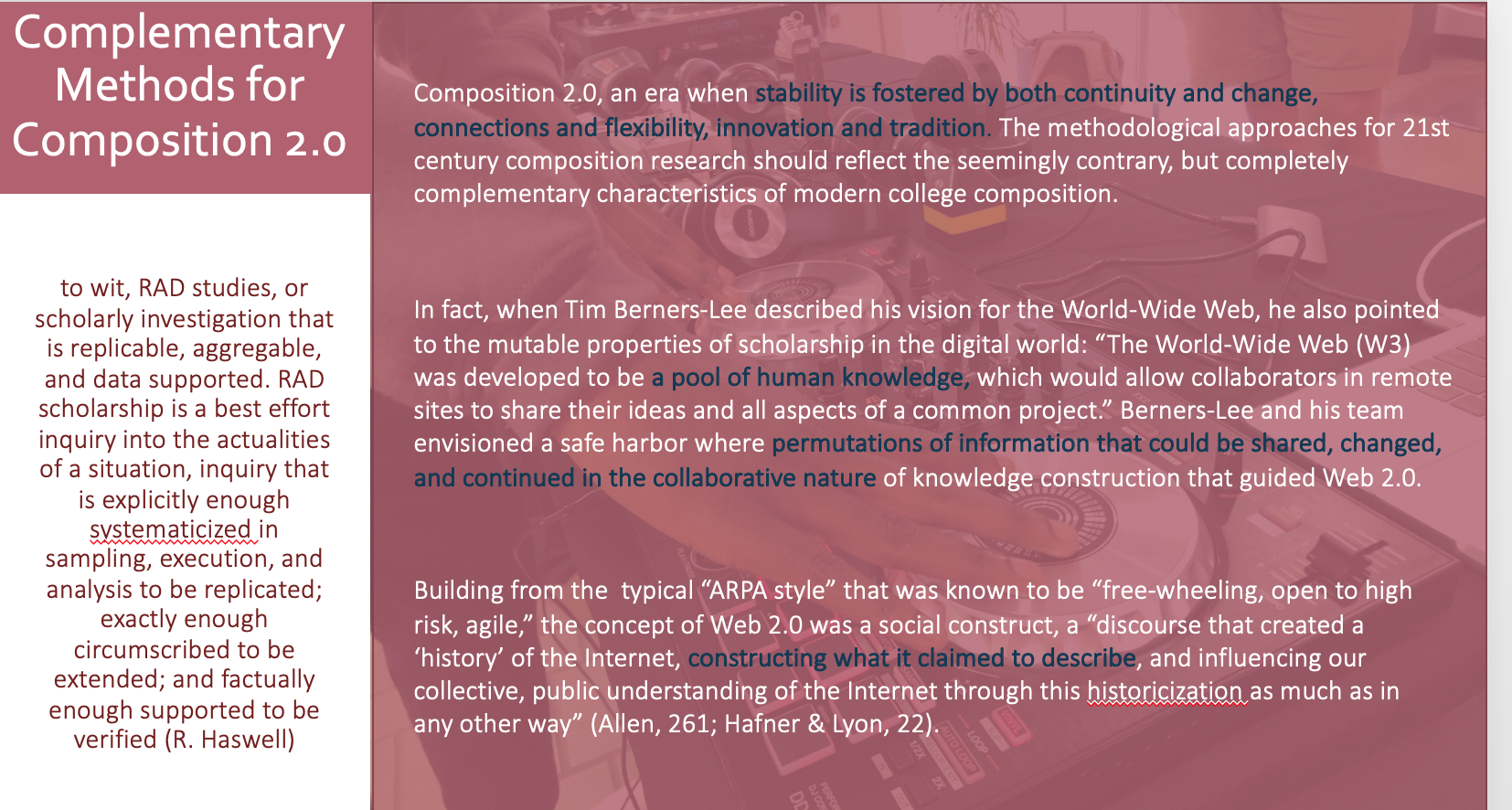 My websites represent a number of different facets of my life including my work in Composition 2.0, my predilections for Wix, digital syllabi for my classes, and personal websites I have created. To see the different websites, please click on the image to learn more.